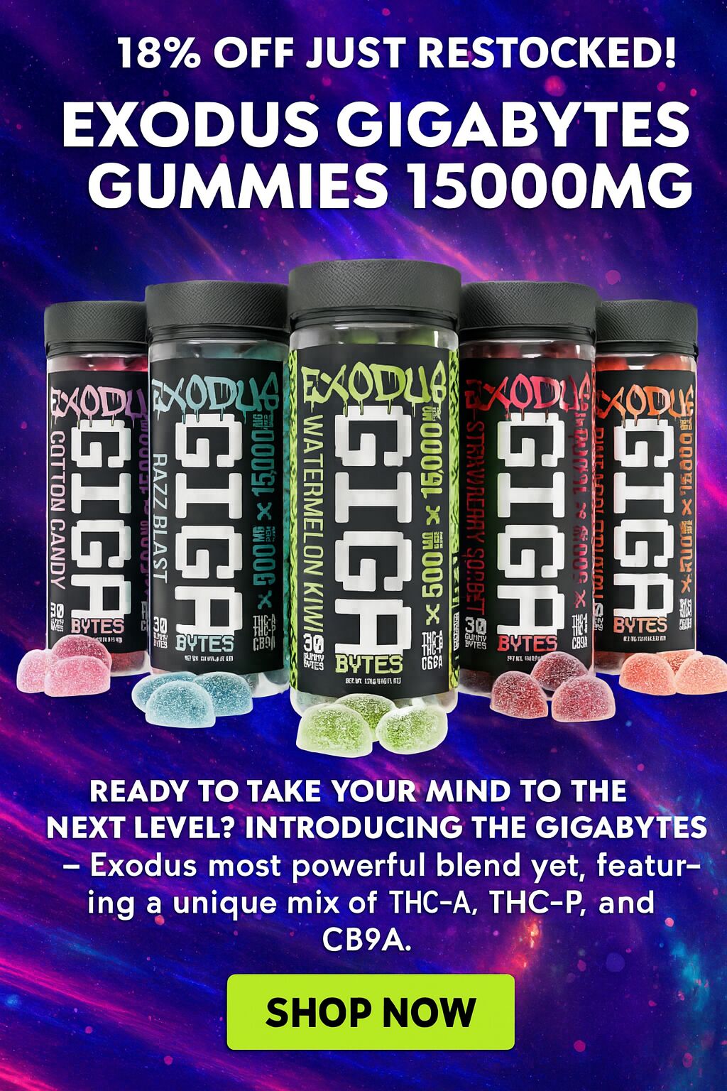 Ready to experience the extraordinary? Exodus Gigabytes are here to reboot, refresh, and supercharge your mind. This isn't your average blend – we're talking about a 15,000mg powerhouse featuring our most potent cannabinoid combination ever: ✨ THC-A - Nature's pre-cursor to pure power ⚡ THC-P - 30x stronger receptor binding 🔥 CB9A - CBD's supercharged evolution