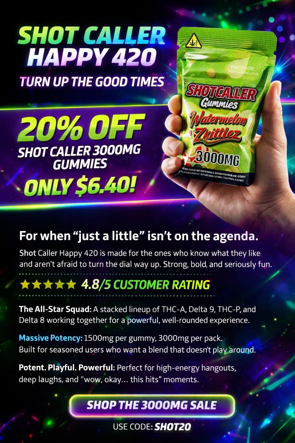 Grab the Shot Caller Happy 420 Blend at 20% OFF. Potent. Playful. Powerful.